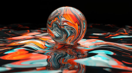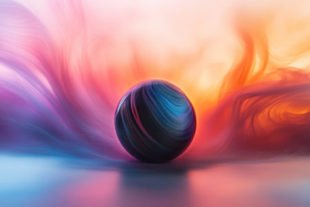 A sphere is surrounded by dynamic swirling colors, creating a vibrant and energetic atmosphere.