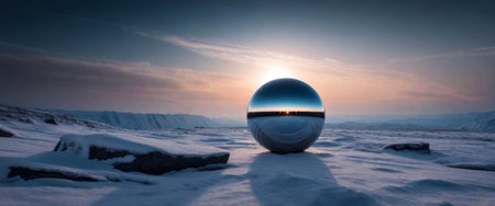 A large orb on a vast ice field with an unimaginable reflection of the sun's light.