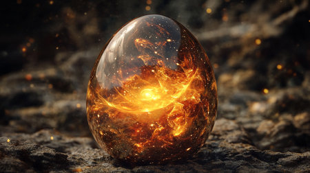 A glowing egg rests amidst flowing lava, surrounded by sparks and intense heat at a volcanic site.