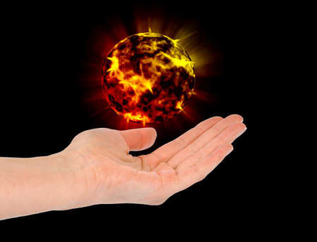 Open woman hand with fire ball
