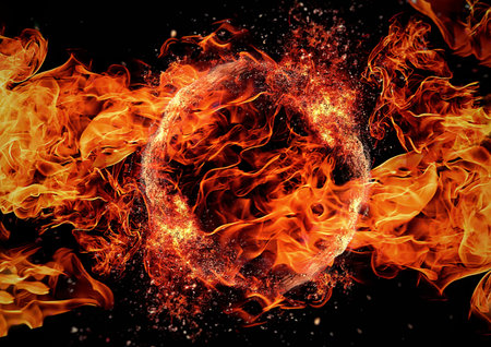 A captivating image showcasing a detailed ring of fire with vibrant, intense flames against a stark, dark background, creating a visually striking and mesmerizing effect conveying energy and passion. AI generated image