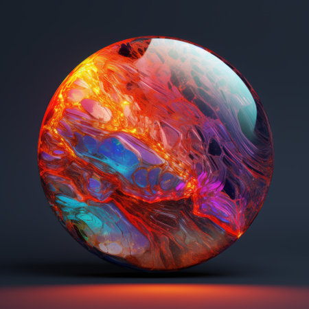 A luminous circular form pulsates with fiery hues and intricate geometric patterns, illustrating dynamic data flow and high-tech energy visuals.