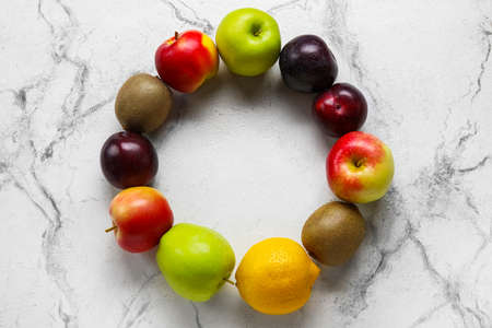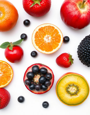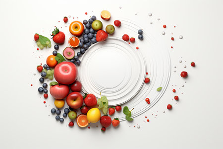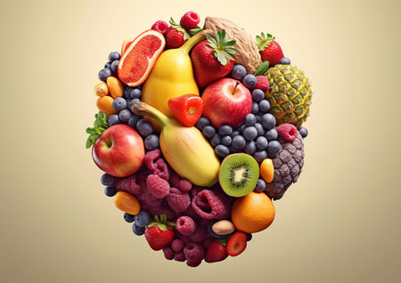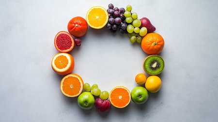A vibrant assortment of different fruits, including apples, oranges, and pears, is arranged in a circular composition. The image showcases a range of colors and textures, set against a plain background. The composition suggests a healthy lifestyle. It may be suitable for use in food, health, and design-related projects.