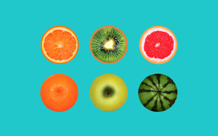 Summer juicy round slices of different fruits isolated on blue background, grapefruit, watermelon, kiwi, apple and orange