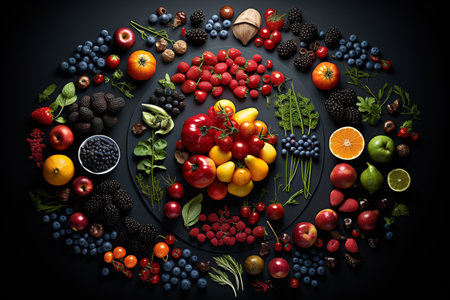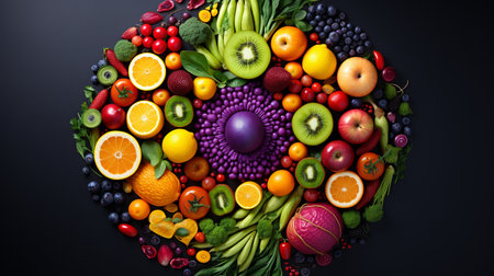 fruits and vegetables arranged in the shape of a circle on a black background, with space for text stock photo. Generative AI