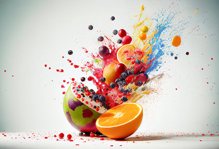 Assortment of different exotic and fantastic fruits and berries, mixed fruit falling and exploding in colorful juices splashing made with Generative AI