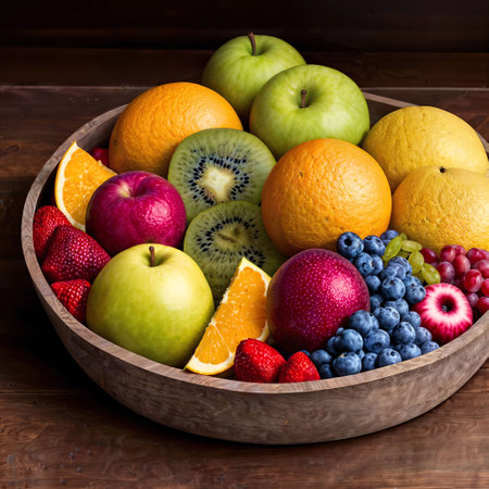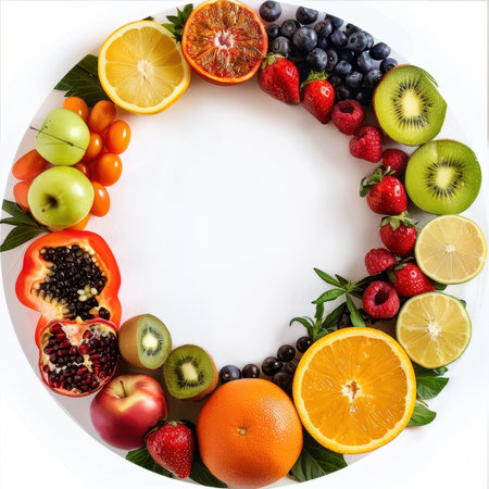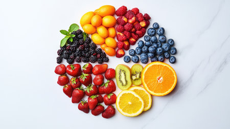 Colorful and Vibrant Arrangement of Sliced Fresh Fruits in Circular Pattern with Berries, Citrus, and Kiwi for Healthy Eating Concepts