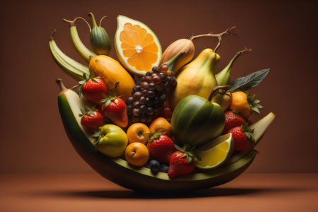 Fruits and Vegetables in a Bowl on a Brown Background. ai generated