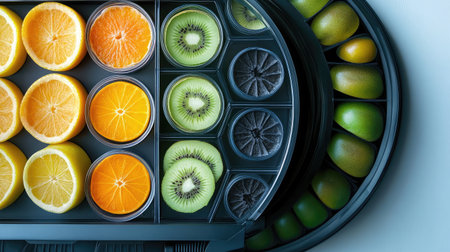 A vibrant display of fresh fruits including oranges, kiwis, and limes arranged in a modern tray, perfect for healthy recipes or culinary presentations.