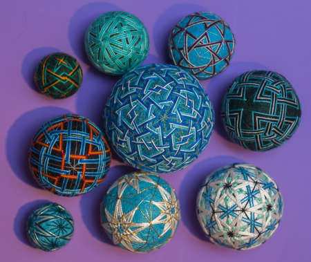 Temari balls, a handicraft ball in traditional Japanese style. Japanese culture. Closeup Christmas gift.