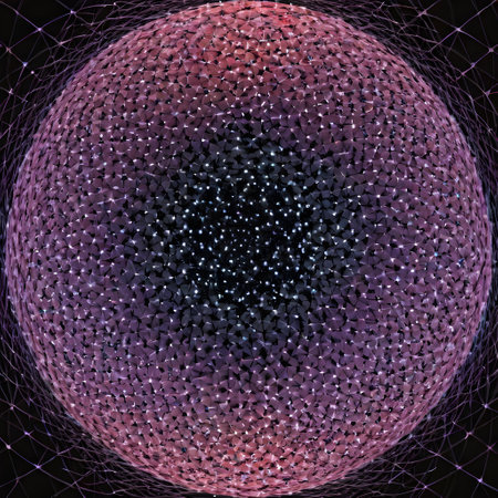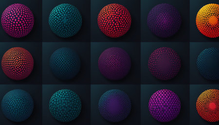 A vibrant sphere displays a complex pattern of textured dots in various colors, creating a striking visual effect against a black backdrop.