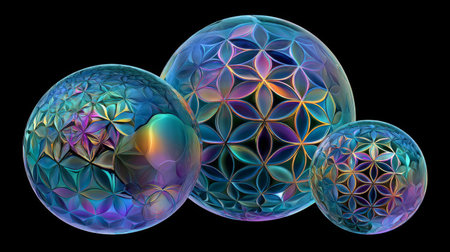 Explore this stunning abstract artwork featuring vibrant spheres with intricate patterns and an ethereal glow, set against a deep black background. Perfect for modern decor.