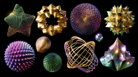 A collection of abstract 3D shapes with vibrant colors and intricate textures set against a black background, perfect for digital art and design applications.