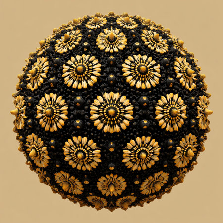 Black sphere with intricate yellow floral motifs and textured black surface creating ornamental pattern and warm contrast, elegant ornamental abstract object evoking decorative luxury