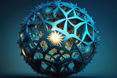 a blue sphere, crafted in a geometric shape, showcases the intricate woven and perforated design. inspired by traditional japanese artistic techniques, this unique piece incorporates unconventional materials. the darkly detailed and carved surfaces add depth and texture. captured with a helios 44-2 58mm f2 lens, the navy and bronze tones enhance its visual appeal. ai generated