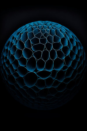 Blue metallic sphere on black background with hexagon pattern generated by artificial intelligence
