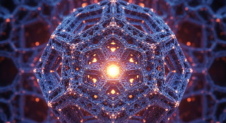 A set of glossy spheres with a hexagonal pattern radiate a red glow against a dark backdrop, perfect for digital or print applications in modern artistic designs.