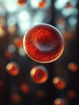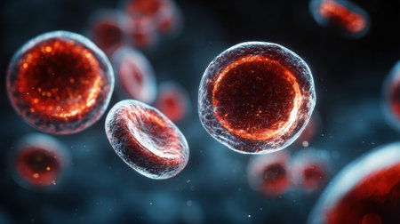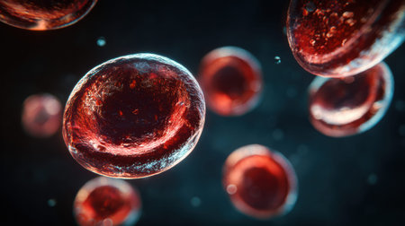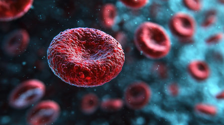 A macro view shows blood cells floating in a dark space with creative lighting highlighting their structure and details for educational purposes.