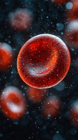 Stunning closeup of vibrant cells floating in a dynamic environment. Perfect for science and health themes, emphasizing exploration and microscopic beauty in biology.