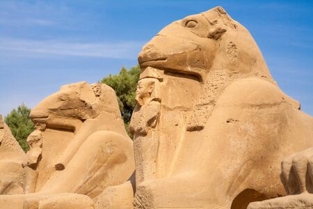 Sculptures of criosphinx in Karnak temple in Luxor, medium view. Row of ancient statues on background of clear blue sky. Selective soft focus. Blurred background