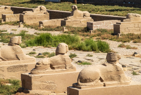 Row of ancient ram-headed sphinx statues stand majestically their weathered stone faces gazing into the distance.