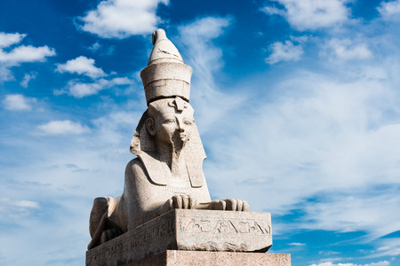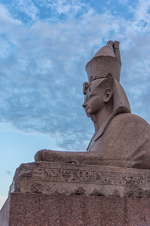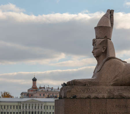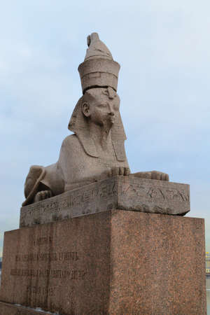 Authentic antique Egyptian sphynx on quay of the Neva river against cloudy sky in Saint-Petersburg, Russia. One of the prominent landmarks in Saint Petersburg.