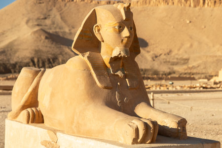 The Sphinx, symbol of strength and protection, guards the entrance of the mortuary temple of Hatshepsut. Located in Luxor, it is a testimony of the reign of the pharaoh.