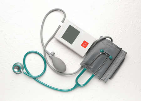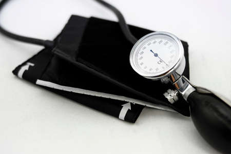 Sphygmomanoneter on white background. Blood pressure device. Copy space