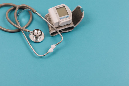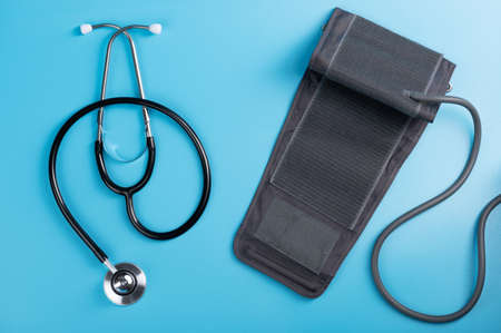 Stethoscope and tonometer on a blue background, the concept of diagnostics of heart and vascular diseases.