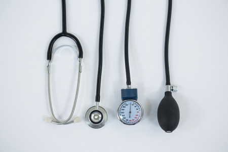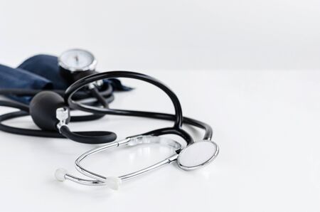 Medical equipment including stethoscope and blood pressure meter on white background.