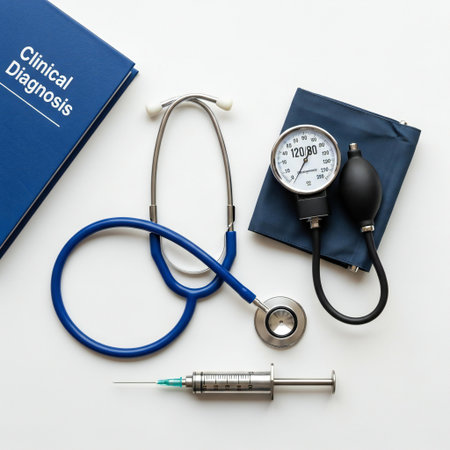 A detailed arrangement of medical tools including a stethoscope, blood pressure monitor, and syringe placed next to a clinical diagnosis book.