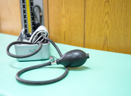Ancient medical equipment: close-up retro manometer, blowing pear. Vintage background from a collection of antiques. Close-up selected focus