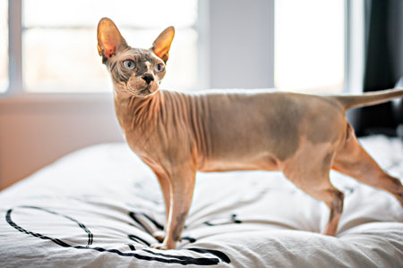 A sphynx cat with striking features looks out a window its furless skin highlighting its unique characteristics. Sunlight fills the room creating a peaceful atmosphere for the curious cat.