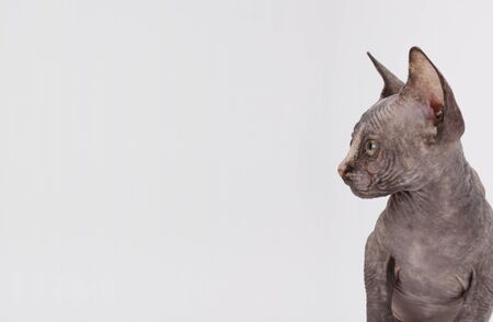 Selective focus. Small gray domestic cat Sphynx close-up and copy space.