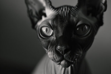 Experience the majesty of a Sphynx cat in a captivating close-up portrait. This high-quality photograph showcases the Sphynx's essence, featuring its detailed features and unwavering presence against the black backdrop