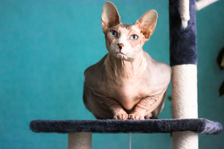 A beautiful gray Canadian Sphinx cat with blue eyes is sitting on a scratching tower and looking directly in the camera. Bald leather cat against a blue wall at sunny day. Lovely pets at home interior