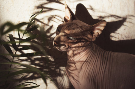 Minimalist photo of a sphynx cat in warm sunlight with dramatic shadows on the wall. Modern aesthetic, cozy atmosphere, natural light, trendy pet portrait for lifestyle and interior design concepts.