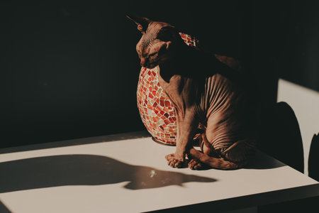 Sphynx cat bathed in dramatic sunlight, sitting on a table beside a mosaic vase. Hairless feline texture, strong shadows and minimalist composition. Moody pet portrait for editorial and lifestyle now.