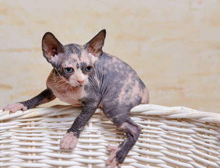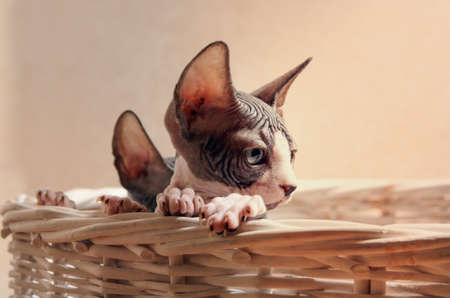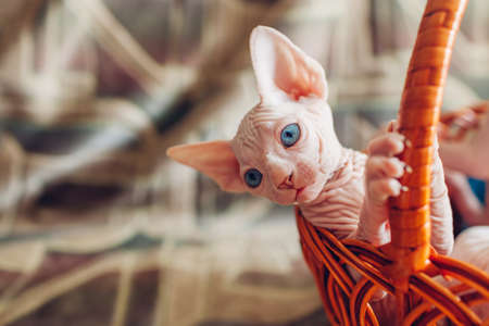 Canadian sphynx kitten sitting in basket at home. Hairless pet has blue eyes. Curious cat