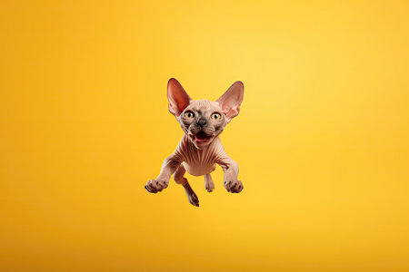 Happy Sphynx Cat In Jumping, In Flight On Yellow Background