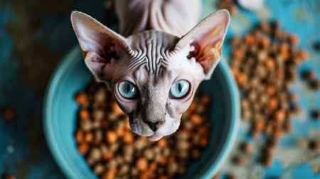 Little cute sphynx cat feeds from a small bowl. Direct look of the cat. Light blue and pink color palette. Generative AI.