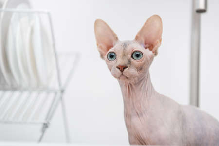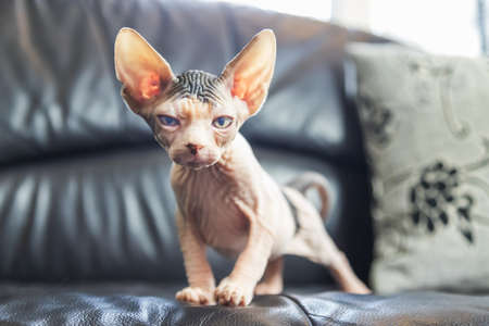 Curious Sphinx cat looking at the camera. Sphynx female kitten is five months old. Lovely cat with light naked skin
