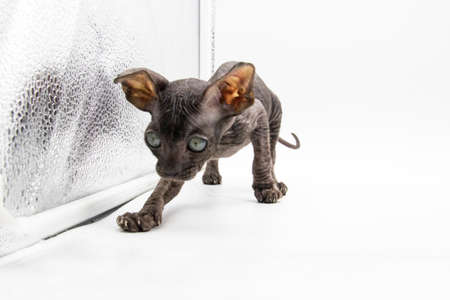 Beautiful gray Sphynx kitten play on the white background.