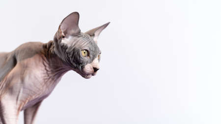 Portrait of young Sphynx Hairless cat on white background. Male kitten of blue and white color, with big yellow eyes is four months old. Studio shot cat. Horizontal banner with copy space.