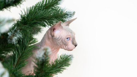 Canadian Sphynx Cat surrounded by green branches of Xmas tree. Copy space