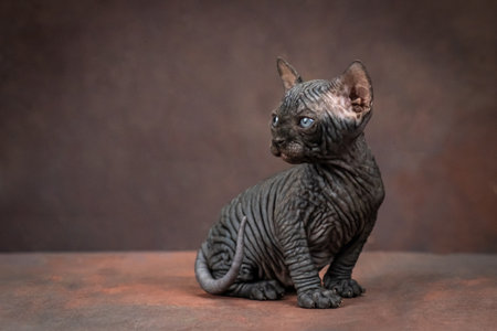 Sphynx kitten posing on a brown background. An elf with blue eyes, studio shooting.