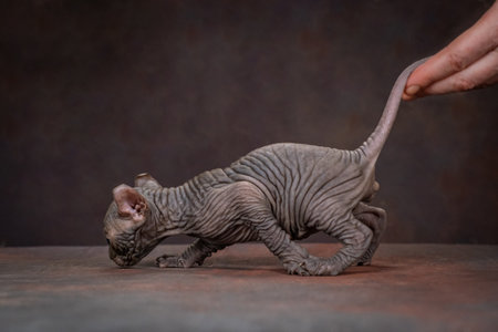A Sphynx kitten with a human hand. Studio shooting, brown background