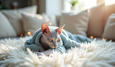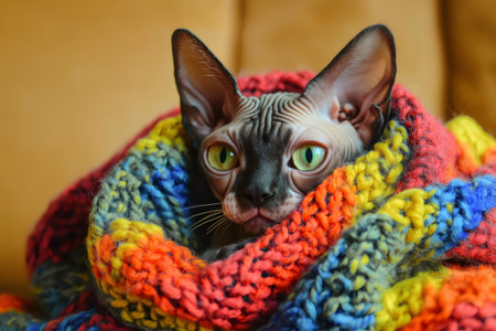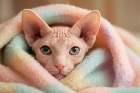 Adorable sphynx cat wrapped in a warm and soft colorful blanket, enjoying comfort and warmth