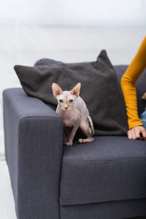 Cropped view of sphynx cat sitting near woman n couch