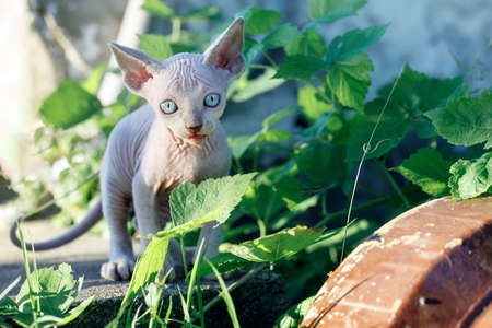 Cute Canadian sphynx kitten sits in a sunlit garden, surrounded by greenery leaves. A hairless cat posing in nature at summer time. Concept, pets love, animal life, cats breeding, enjoy freedom